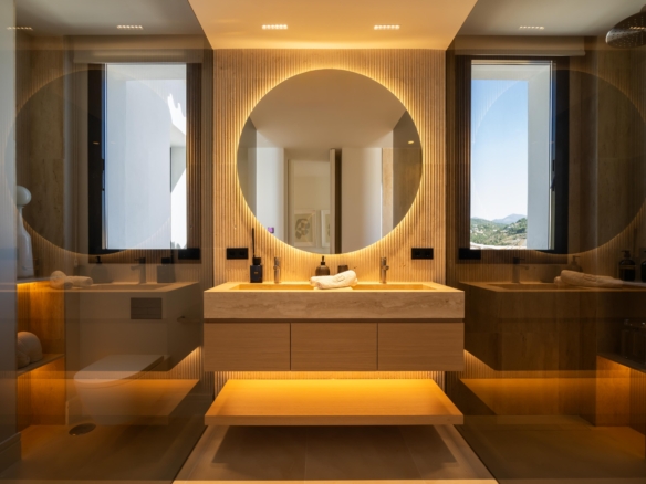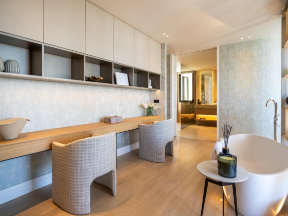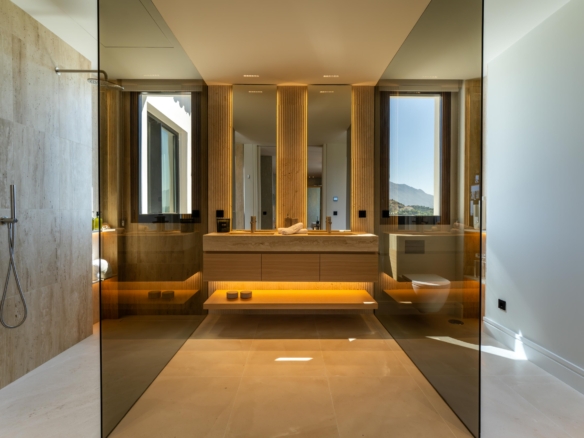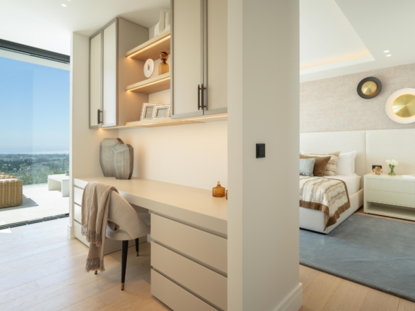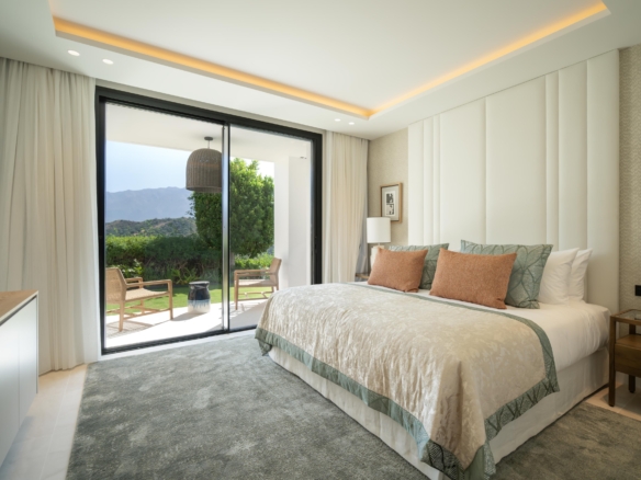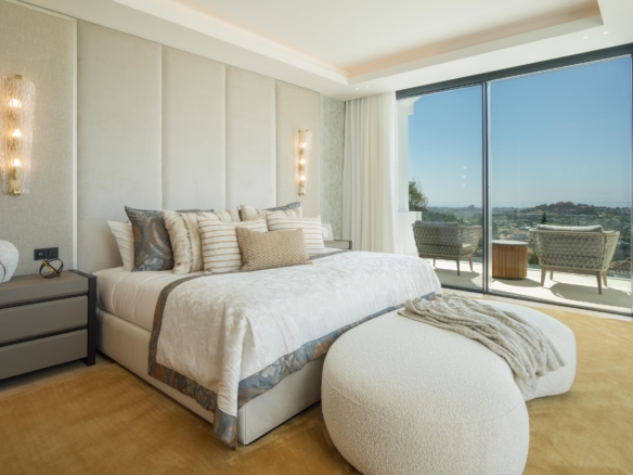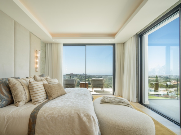 The villa’s bedrooms are exquisitely designed, with the master suite standing out as a true private retreat. This master bedroom exudes comfort and sophistication and opens onto a private terrace offering panoramic views of the surrounding landscape and the Mediterranean Sea.