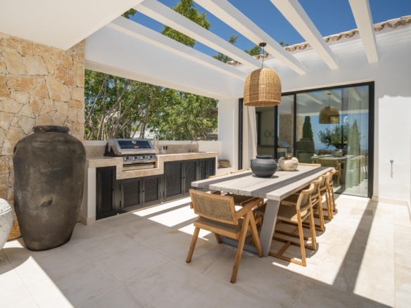 The property is set on a beautifully landscaped plot with meticulously maintained gardens. The outdoor area features a private pool and several inviting chill-out zones, perfect for relaxation. Additionally, an outdoor kitchenette complete with a BBQ makes it an ideal spot for entertaining guests or enjoying al fresco dining.